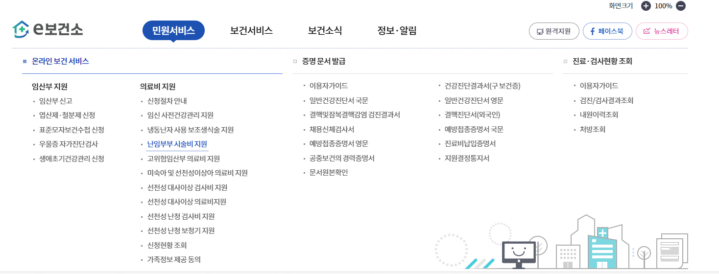 2. ‘민원서비스’ 메뉴에서 ‘난임부부 시술비 지원신청’을 선택하고,