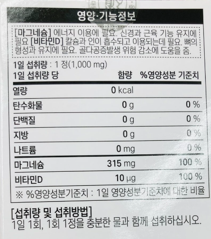 315mg의 산나 마그네슘과 비타민 D 400IU가 들어가 있어,