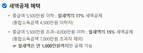 - 연간 최대 1,000만 원의 월세액에 대해 공제 가능
