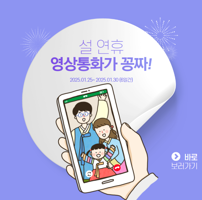 - SK텔레콤, KT, LG유플러스 등 주요 통신사에서 제공하는 영상통화 기능은 별도의 가입 절차 없이 연휴 기간 동안 무료로 이용 가능합니다.(해외 제외)