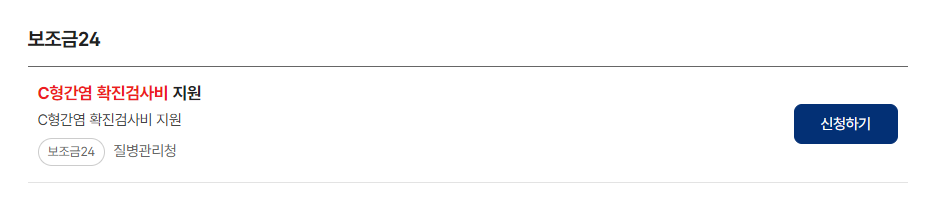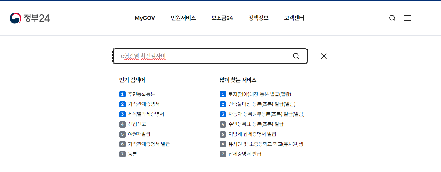 - ‘정부24’ 로그인 후, 검색창에 "C형간염 확진검사비 지원"을 입력하여 해당 페이지로 이동합니다.