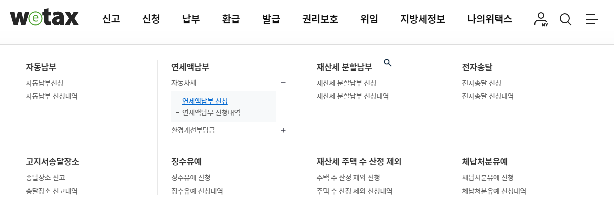 - 위택스(WETAX): 위택스 홈페이지 '신청' > '연세액납부' > '연세액납부 신청' 또는 모바일 앱에서 '부가서비스' > '자동차세 연납 신청' 메뉴를 통해 신청 가능합니다.